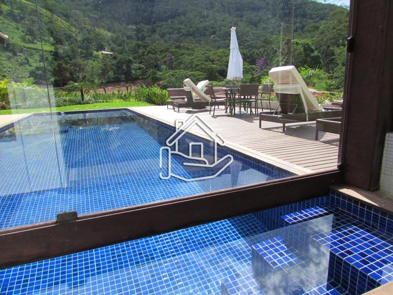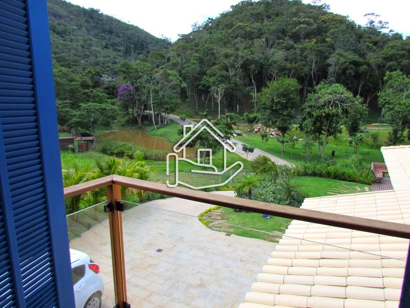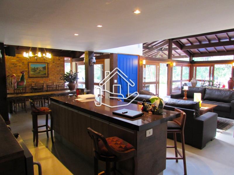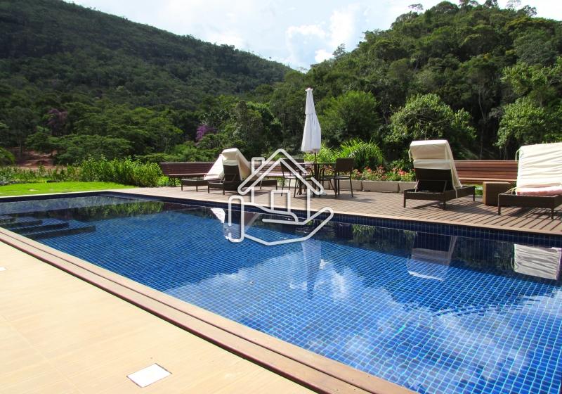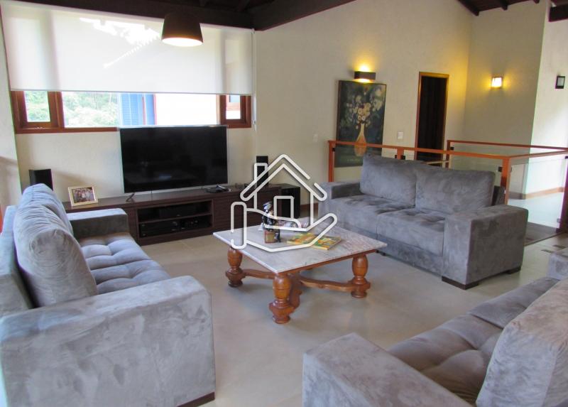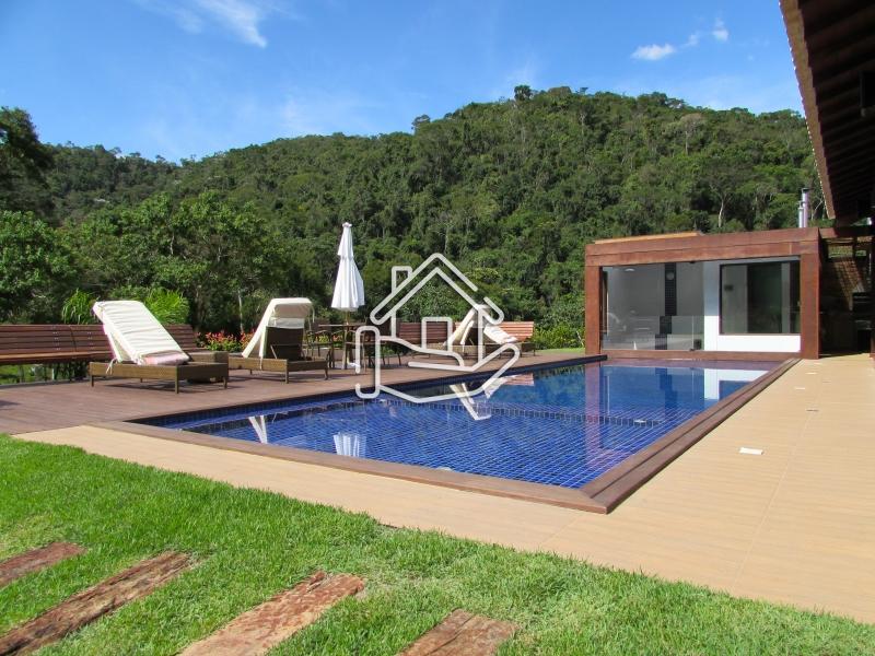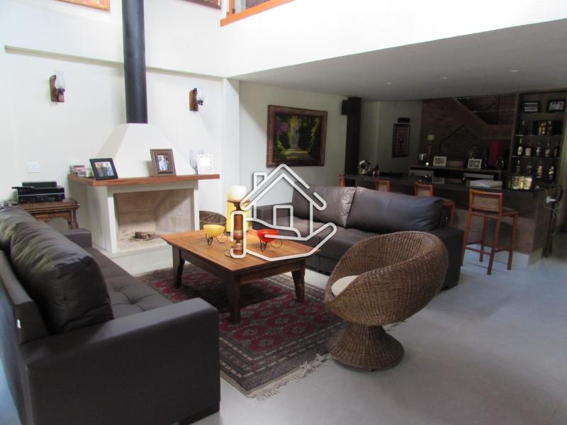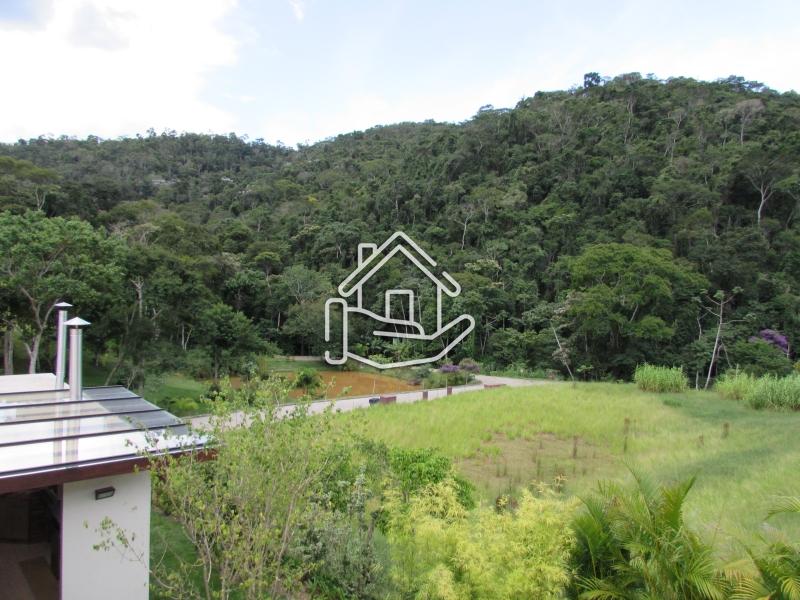 Excelente terreno de 3.206m² em aclive com 600m² de área construída. Casa recém construída em dois pavimentos com varanda gourmet com TV, forno de pizza, churrasqueira, lavabo, ducha, sauna a vapor com ducha integrada e acesso para piscina; sala em vários ambientes com pé direito duplo, som ambiente em toda casa, lareira, sala de jantar, bar, lavabo, 2 suítes com split, varanda (sendo 1 suíte com closet e