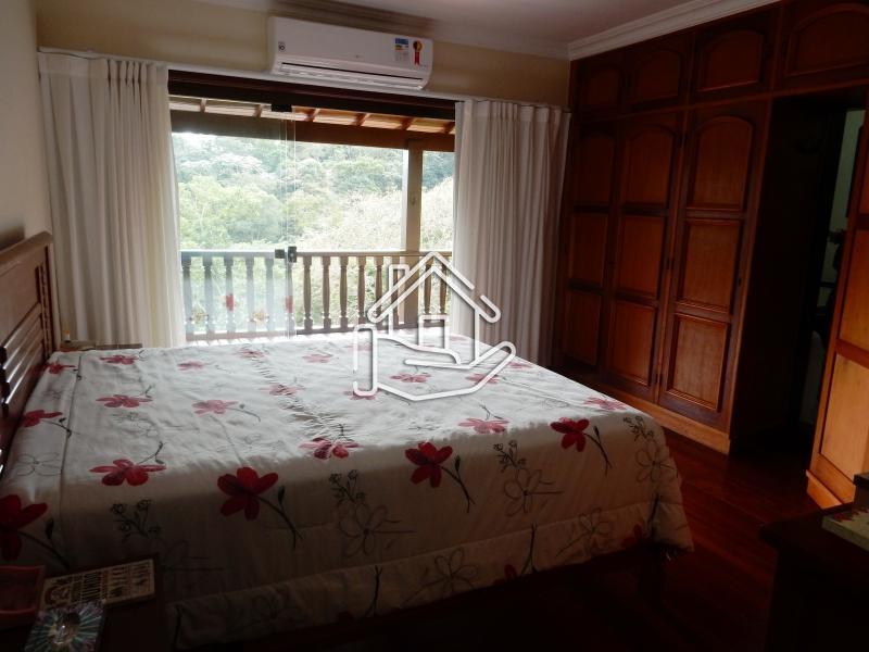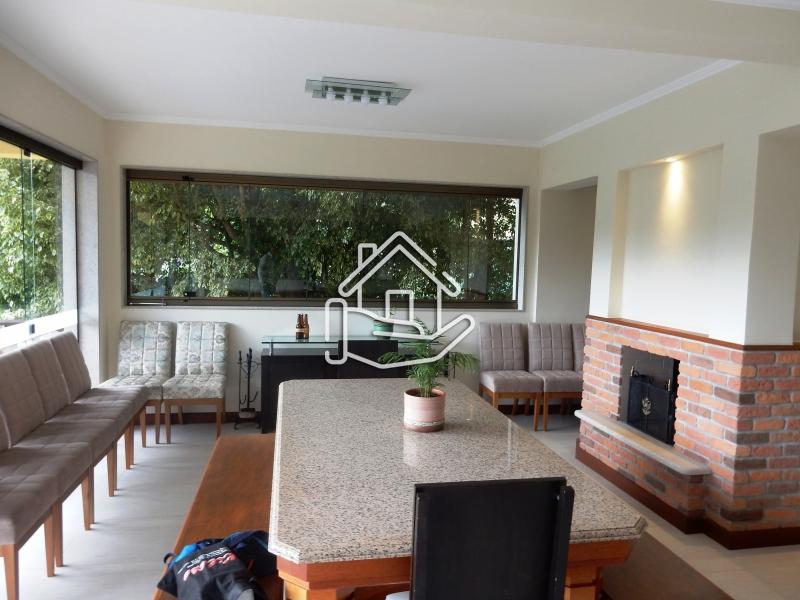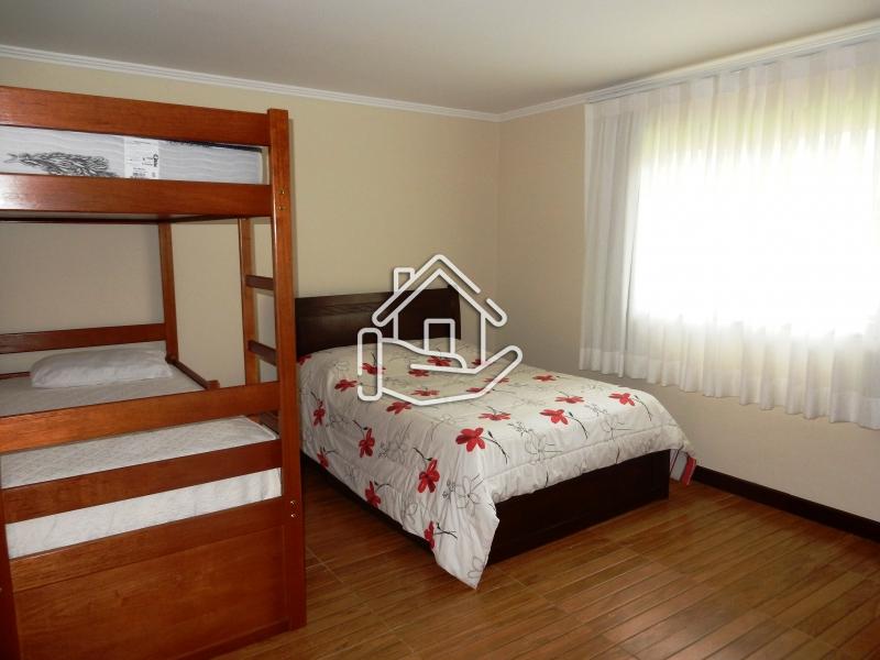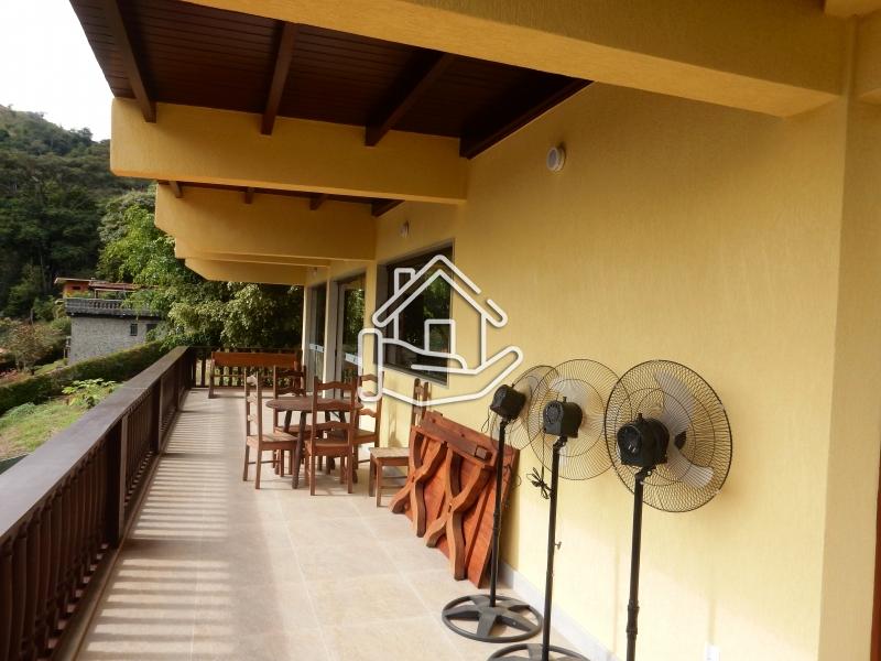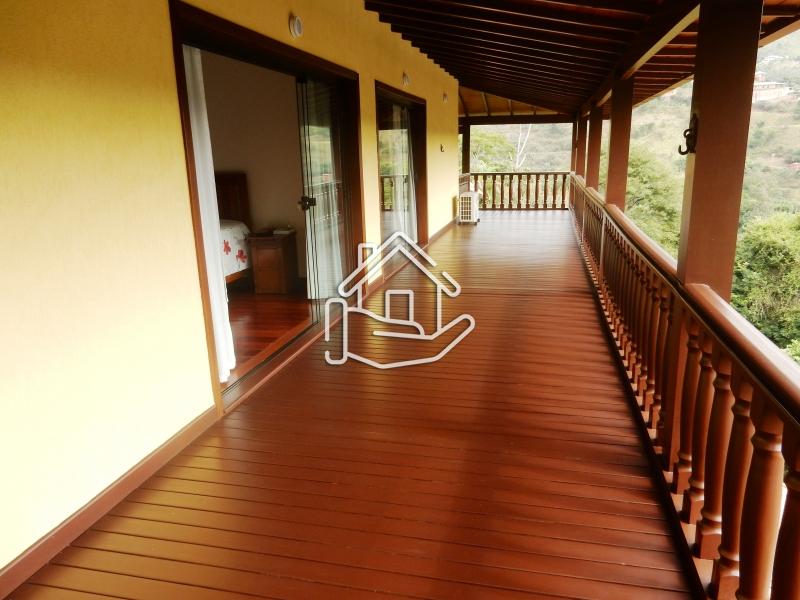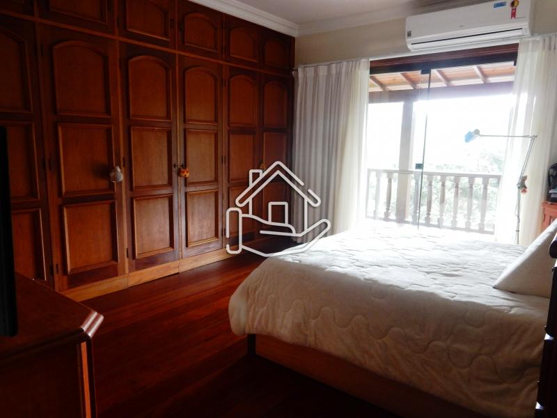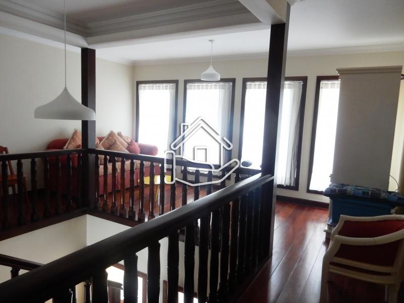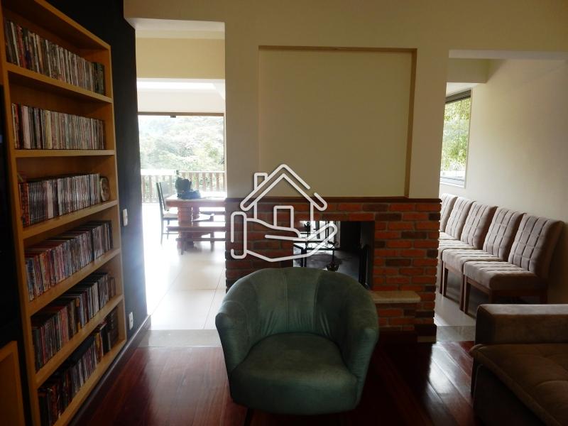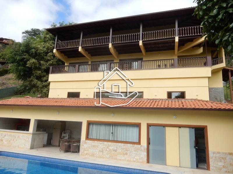 Terreno de 5.000 m² em suave declive e 860 m² de área construída. Casa construída em três pavimento sendo o pavimento de entrada com lavabo, varandão, adega, 2 banheiros sociais, escritório, 2 quartos com split quente/frio, cozinha com armários, despensa, sala TV com piso em tábua corrida e sala de jantar com lareira. Pavimento superior com piso todo em tábua corrida, mezanino, 4 suítes c/ armários (sendo 2 com varanda e split