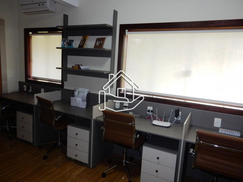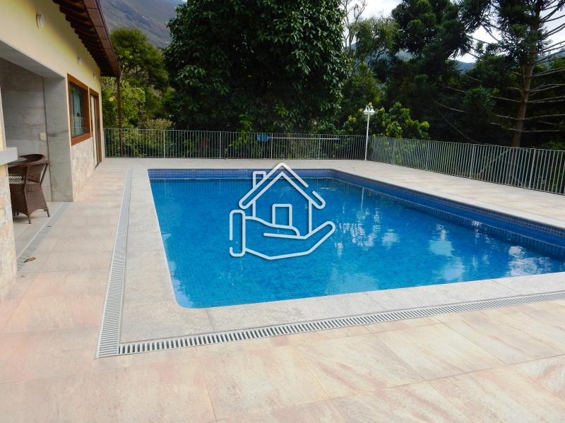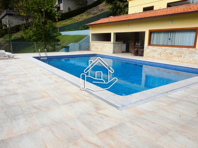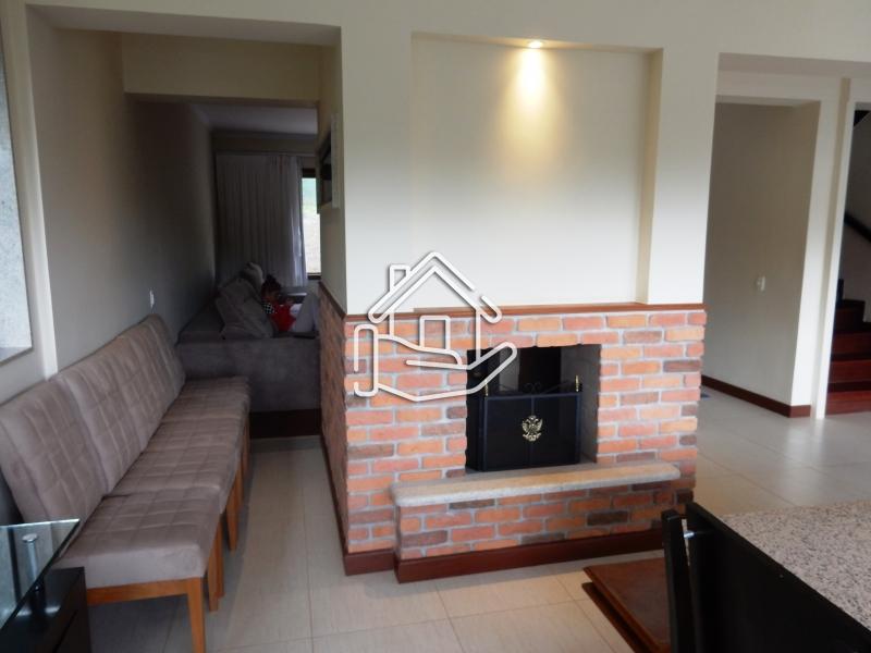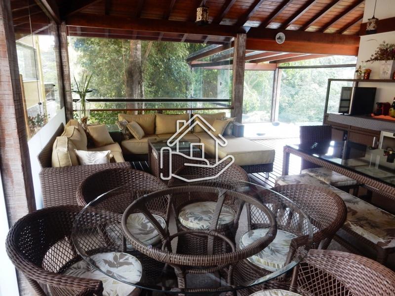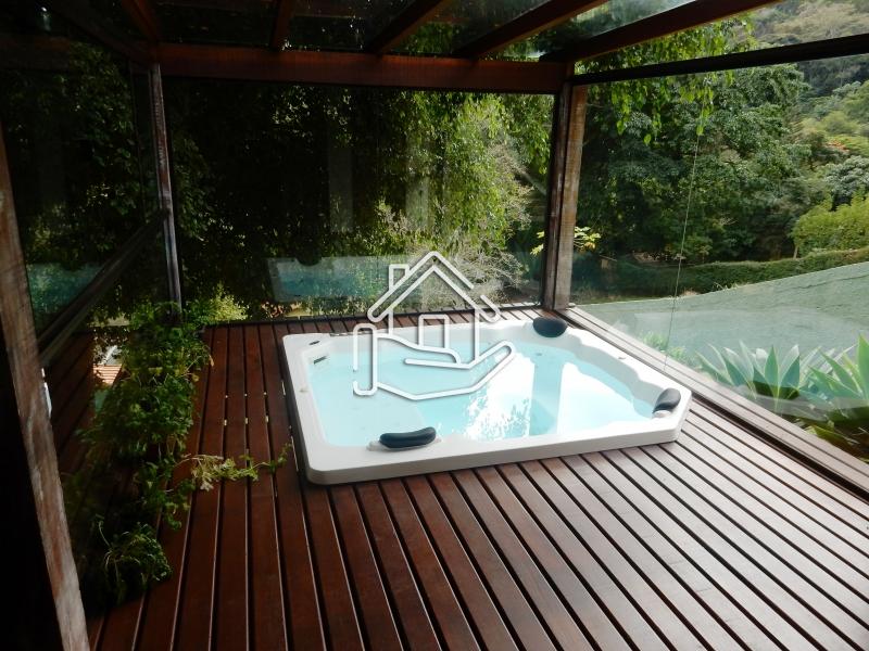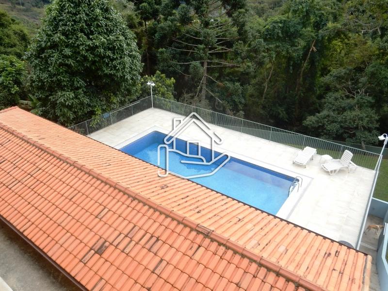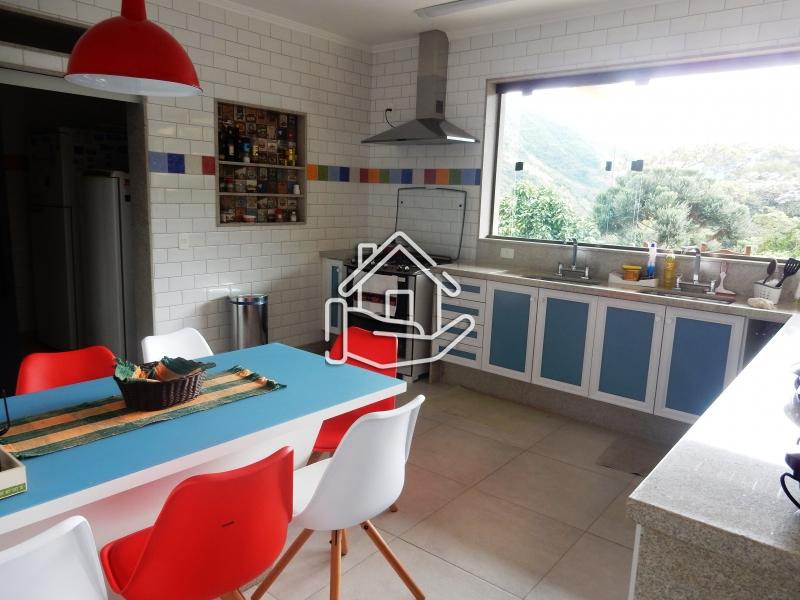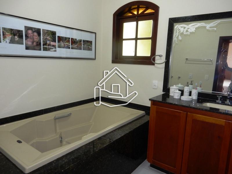 Terreno de 5.000 m² em suave declive e 860 m² de área construída. Casa construída em três pavimento sendo o pavimento de entrada com lavabo, varandão, adega, 2 banheiros sociais, escritório, 2 quartos com split quente/frio, cozinha com armários, despensa, sala TV com piso em tábua corrida e sala de jantar com lareira. Pavimento superior com piso todo em tábua corrida, mezanino, 4 suítes c/ armários (sendo 2 com varanda e split